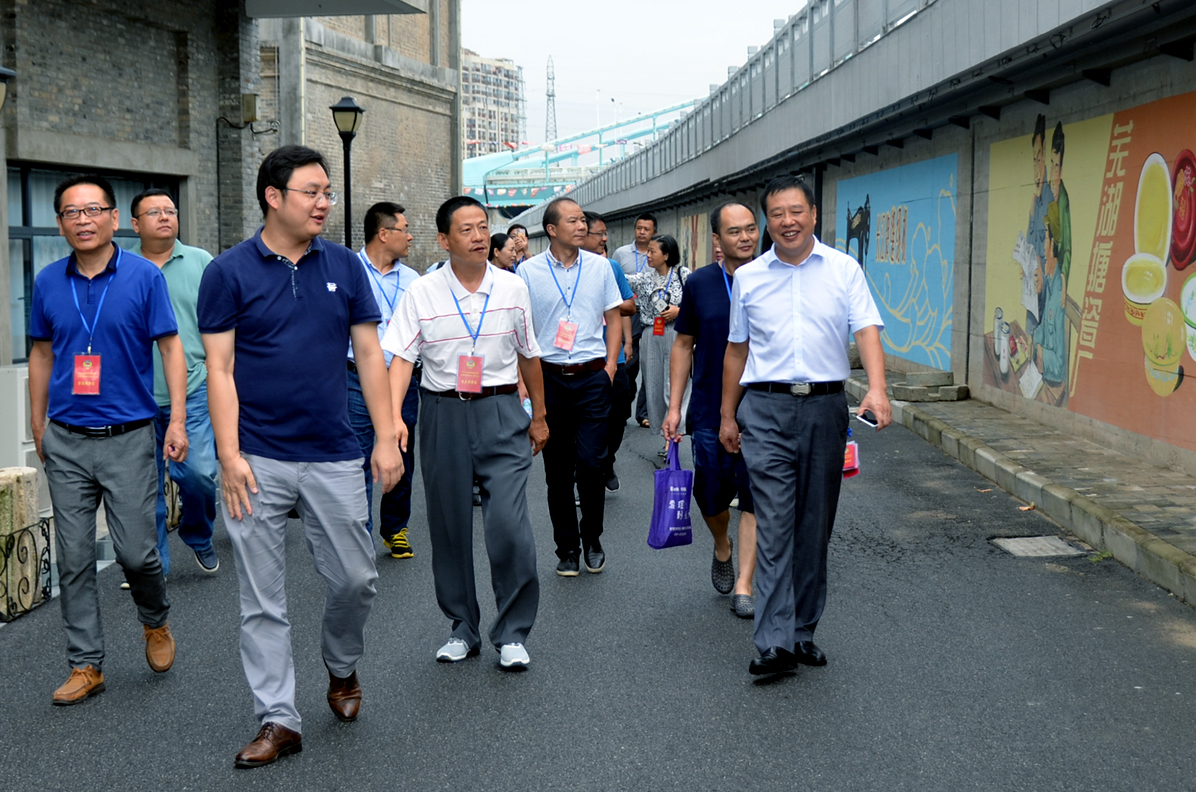 卞總向調(diào)研團(tuán)匯報(bào)了園區(qū)的歷史傳承、改造歷程及目前的基本發(fā)展情況。帶領(lǐng)參觀了益新面粉大樓及大礱坊歷史文化長廊,作為蕪湖工業(yè)象征的“兩個(gè)半煙囪”的僅存見證,百年益新面粉大樓在經(jīng)過修整后也再次踏上新的征程。而在今年8月正式竣工的大礱坊歷史文化長廊,利用墻繪的方式,生動的記錄了礱的誕生以及大礱坊的工業(yè)歷史變遷,長達(dá)450米的手工墻繪,目前已成為蕪湖的一張文化名片。