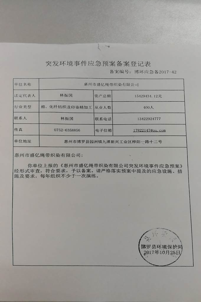 附件鏈接:《惠州市盛億繩帶織染有限公司突發(fā)環(huán)境事件應(yīng)急預(yù)案備案登記表》