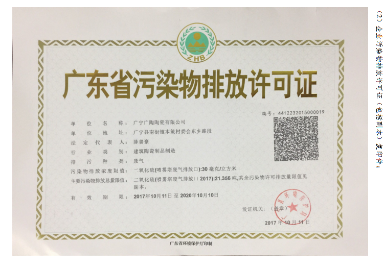 | 排污許可證(廣東。 | 附件鏈接:《廣寧廣陶陶瓷有限公司排污許可證》 | ||||||||